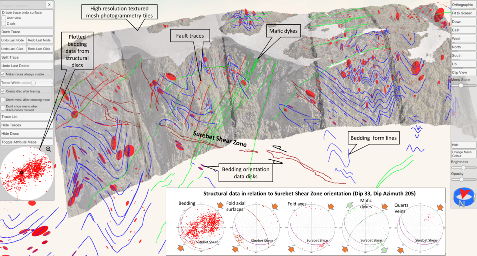 Ron imported these high-resolution tiles into HiveMap, and built out a detailed structural interpretation of the cliff face, capturing information on the ductile deformation, defining folds and fold axes, timing relationships by looking at the cross-cutting patterns between faults, intrusions and bedding, form surfaces, as well as tracing the Surebet Shear Zone, accurately locating its contacts, continuity, and geometry.